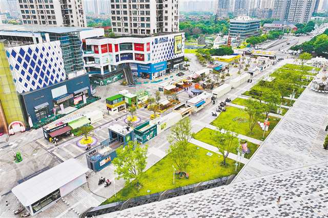 這里曾是一片閑置區(qū)域。此前,有市民曾在“民呼我為”平臺反映,此處車輛亂停亂放,壓壞路面,既不安全又影響城市美觀。二郎街道通過政企合作模式,推動閑置地塊“變身”成為PulsePod云嘻街商業(yè)街區(qū),不僅設(shè)置了休閑座椅,還增設(shè)了美食店、時尚零售店、寵物生活館等,為市民提供消費(fèi)新場景。