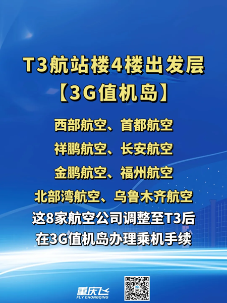 西部航空、首都航空、祥鵬航空、長(zhǎng)安航空、金鵬航空、福州航空、北部灣航空、烏魯木齊航空這8家航空公司辦理乘機(jī)手續(xù)在3G值機(jī)島。