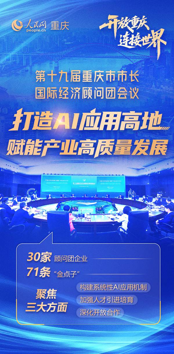 人民網(wǎng)重慶9月26日電 (劉政寧、姚於)9月25日至26日,第十九屆重慶市市長(zhǎng)國(guó)際經(jīng)濟(jì)顧問(wèn)團(tuán)會(huì)議召開(kāi)。本屆會(huì)議主題為“打造AI應(yīng)用高地,賦能產(chǎn)業(yè)高質(zhì)量發(fā)展”,來(lái)自全球11個(gè)國(guó)家和地區(qū)的21家世界500強(qiáng)企業(yè)及行業(yè)龍頭代表齊聚重慶,啟迪智慧、凝聚共識(shí)、深化合作,為新時(shí)代背景下推動(dòng)重慶市高水平開(kāi)放和高質(zhì)量發(fā)展注入強(qiáng)勁動(dòng)能。9月26日,第十九屆重慶市市長(zhǎng)國(guó)際經(jīng)濟(jì)顧問(wèn)團(tuán)會(huì)議新聞成果發(fā)布會(huì)召開(kāi),介紹通報(bào)了相關(guān)情況。