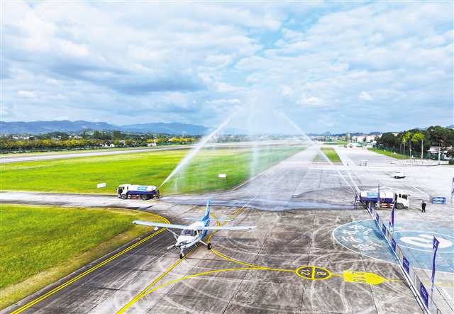 11月11日,梁平機(jī)場,一架貨運(yùn)通用航空飛機(jī)在“過水門”,隨后將飛往湖北荊門漳河機(jī)場,標(biāo)志著重慶首條低空貨運(yùn)航線正式開通。