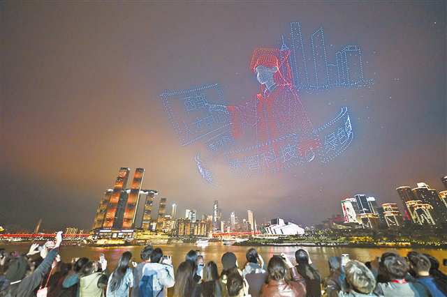 11月14日晚,重慶兩江交匯的夜空被數(shù)千架無人機閃爍燈光點亮?!靶马嵵貞c”無人機燈光秀帶來一場以“才聚新重慶 共創(chuàng)新未來”為主題的專場表演,以光影為筆、夜空為卷,借“星”敘事,鋪陳出一幅海內(nèi)外人才跨越山海、匯聚山城、共繪未來的動人長卷。